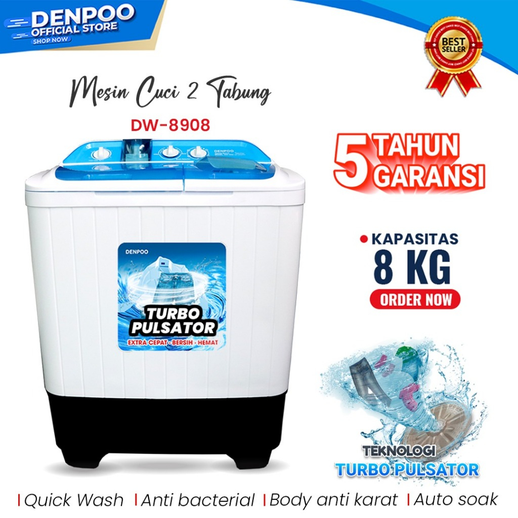VC014 - Denpoo Mesin Cuci 2 Tabung DW 8908 Turbo Pulsator 8KG